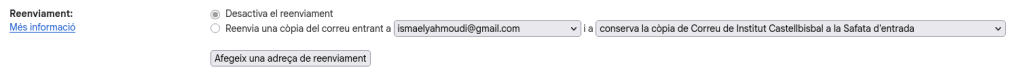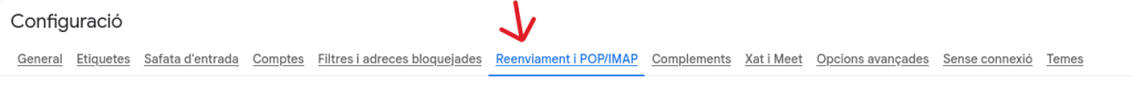 Configuració de redirecció al correu corporatiu Configurar una adreça de reenviament és molt útil, serveix per a enviar automàticament un correu d’una adreça electrònica a un altre adreça. Per a configurar-lo primer has d’entrar al teu compte de Gmail, anar a l’engranatge i a mostra tota la configuració. Una vegada a la configuració anem a la pestanya de “reenviament i POP/IMAP” Quan ja estas a la pestanya de renviament anem a la primera opcio: “reenviament” I per acabar afegim un corre de reenviament confirmem la nostra identitat des de l’altre adreça electrònica i ja ho tindríem. Torna a correu professional