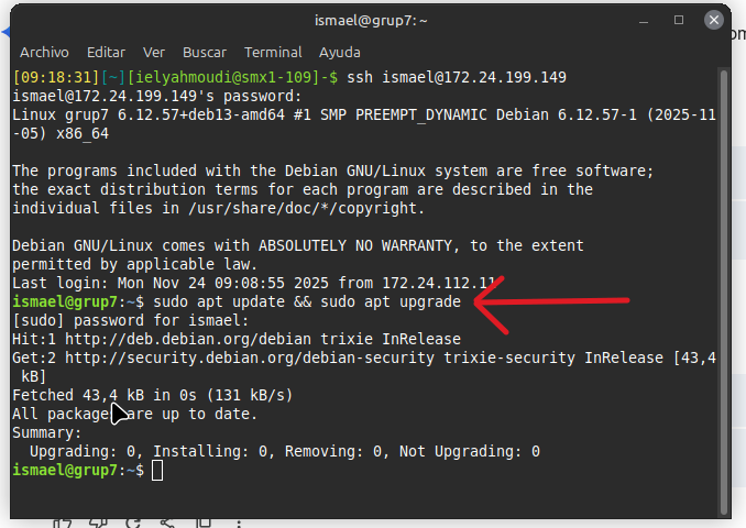 Per fer-ho primer obrim la terminal i escribim “sudo apt update && sudo apt upgrade”.