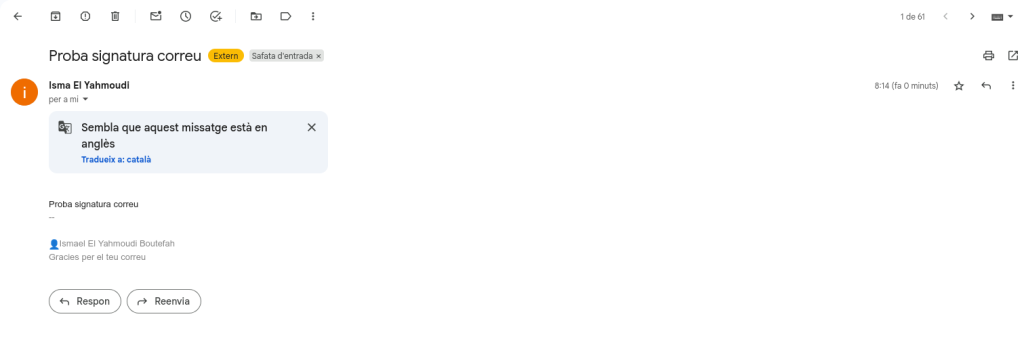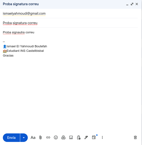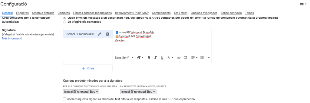 Configuració d’una signatura Configurar una signatura és molt útil per a donar un perfil més professional i per a ser identificatiu, jo he personalitzat la meva. Entra al teu correu, ves a l’engranatge i a mostra tota la configuració. Una vegada a la pestanya general, busquem l’opció signatura, quasi baix del tot. Li posem un nom a la nostra signatura, la personalitzem i la desem, i ja tendríem la nostra pròpia signatura. Torna a correu professional