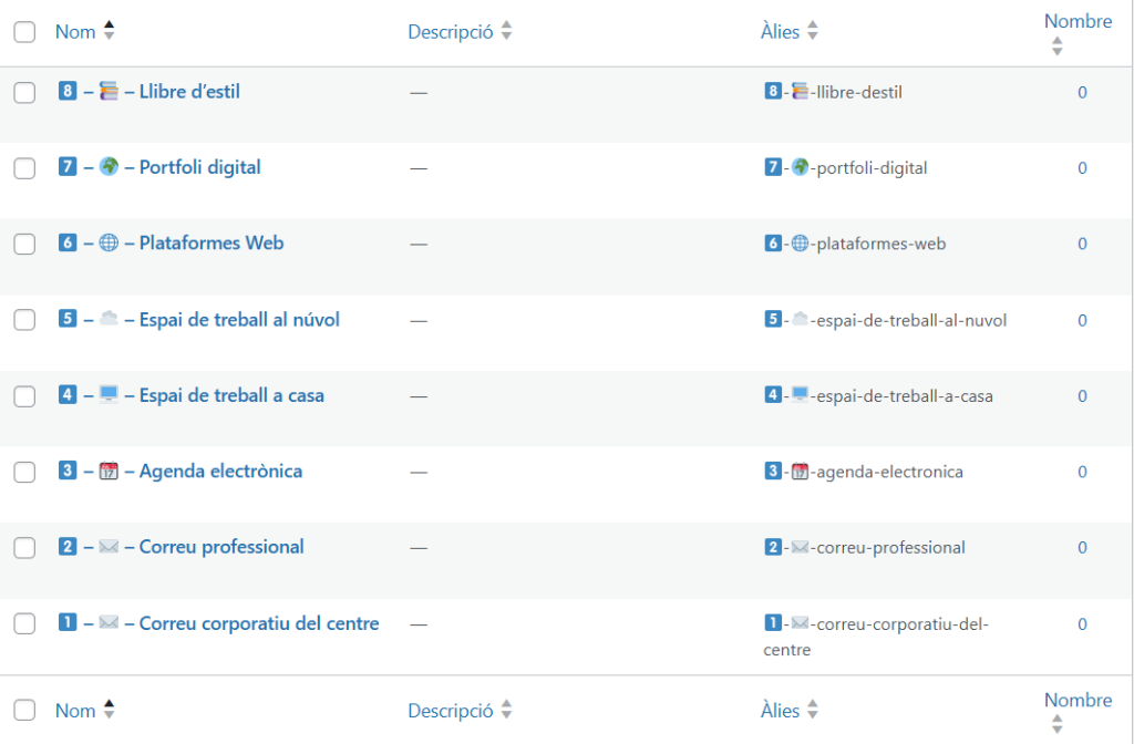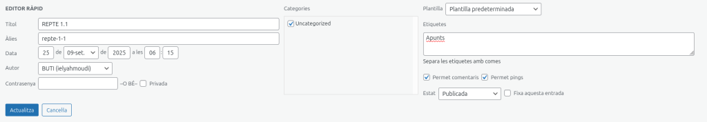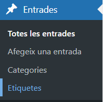 Creació d’etiquetes per categoritzar les entrades He creat una etiqueta per a cada apartat del repte 1.1. Per fer-ho entrem a entrades>etiquetes li posem un nom i li donem a “afegeix etiqueta” I ho afegim a la nostre entrada Torna a portafoli digital