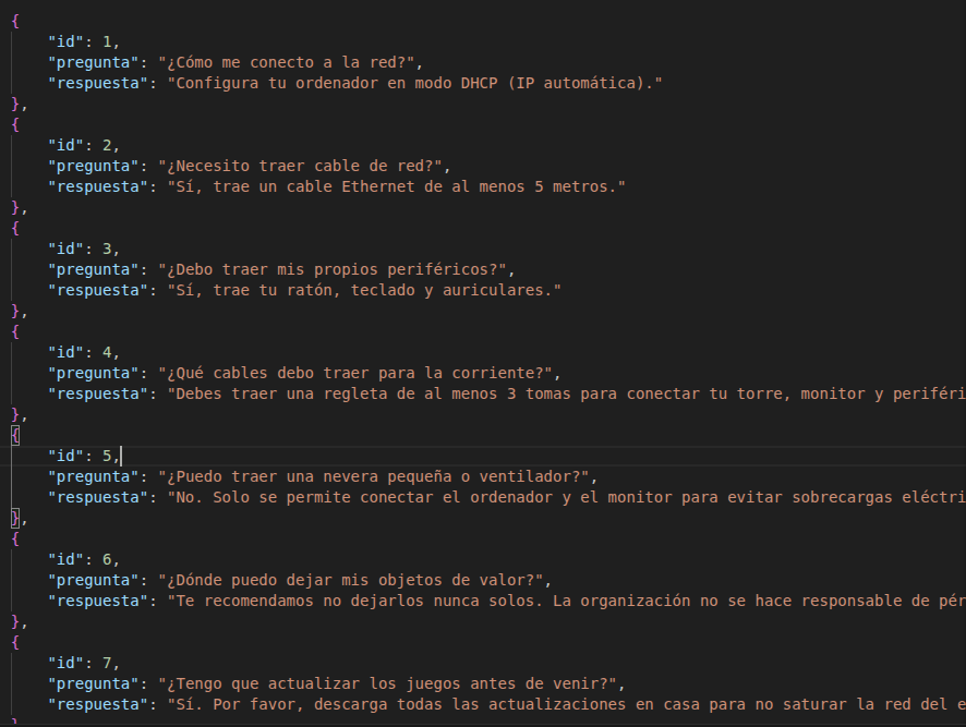 Perquè el xatbot pugui processar la informació, he convertit el document de text a un fitxer JSON. En lloc de fer una llista simple, he creat una estructura organitzada amb IDs (per identificar cada pregunta).