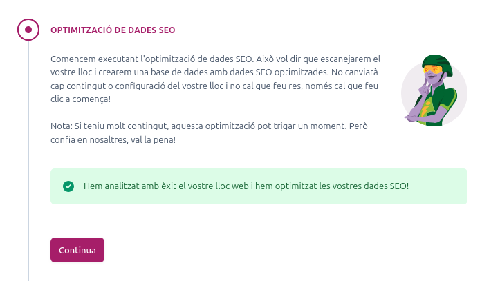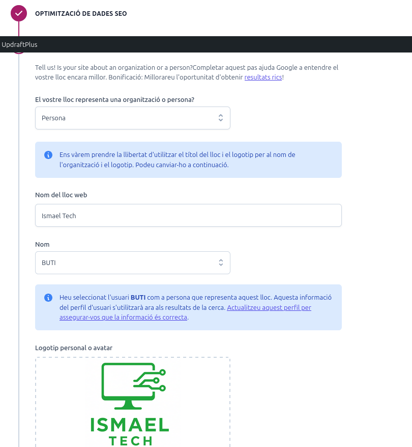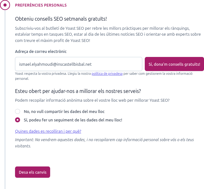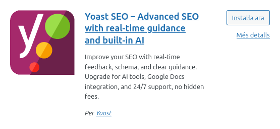 SEO i posicionament Torna a portafoli digital El SEO és la tècnica d’optimització d’un lloc web per a aparèixer en els primers resultats de cerca.Per optimitzar el nostre web instal·larem el plugin “Yoast SEO”.Per instal·lar-lo anem a l’apartat d’extensions>afegeix una extensió. Cerquem “Yoast SEO”, l’instal·lem i l’activem. Els hi donem permis per a optimitzar el nsotre lloc web Facilitem el nom del nostre lloc web i el nostre nom. Seleccionem el nostre usuari. I posem el nostre compte de correu electronic. I ens guiem pels colors sentVerd: bo.Groc: acceptable.Vermell: necessitat de millora.