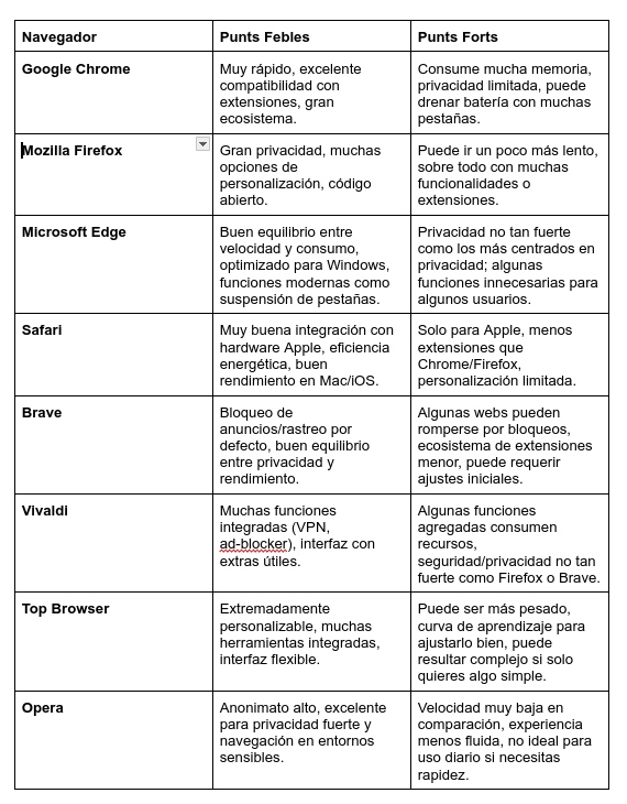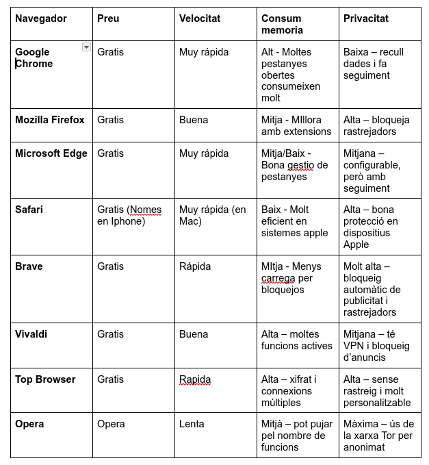 A classe vam treballar amb diferents aspectes relacionats amb navegadors webs. Un dels exercicis que vam fer vas ser fer una taula comparativa de 8 navegadors comparant: Preu, Privacitat, velocitat i consum de memòria. En el meu cas vaig fer amb els següents navegadors:
